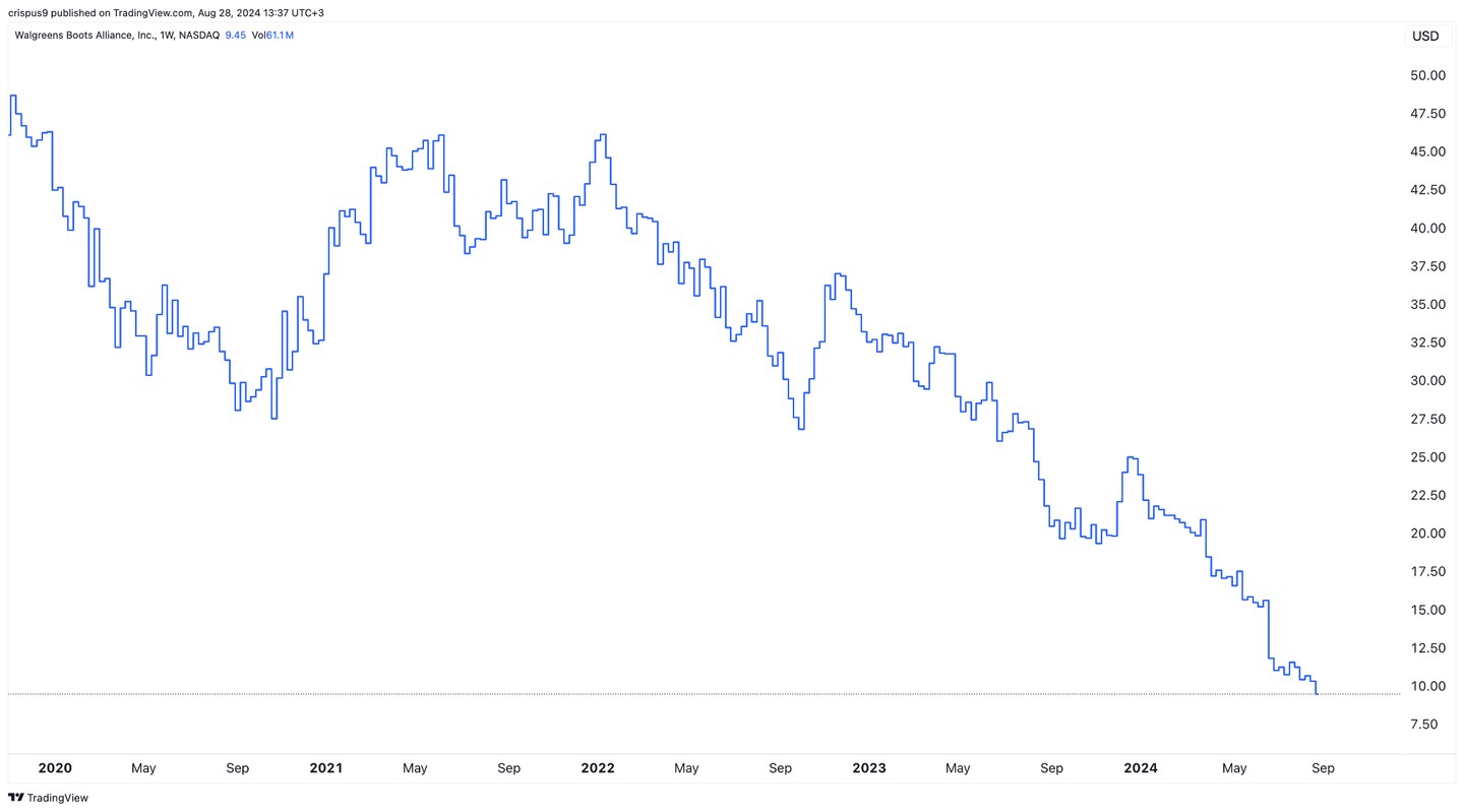 One of the saddest finance stories is unfolding in the United States, where Walgreens Boots Alliance (WBA) is imploding and becoming a fallen angel. The stock has crashed by over 68% this year and by 80% in the past five years. It has dropped to $9.45 and is hovering at its lowest point since 1997.