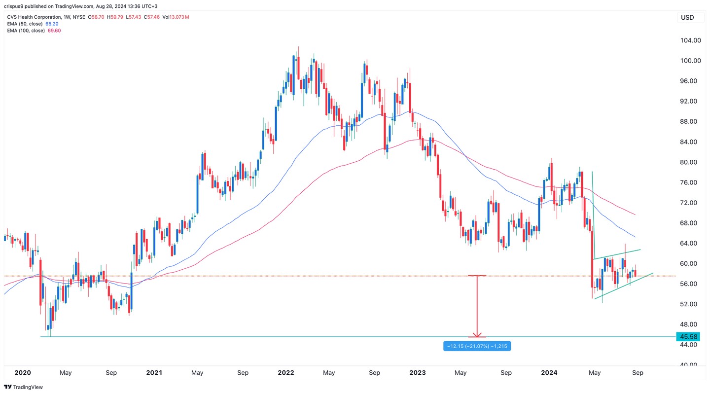 The weekly chart shows that the CVS share price has consolidated in the past few weeks. In this, it has formed a bearish flag chart pattern, a popular sign that it will have a bearish breakout.