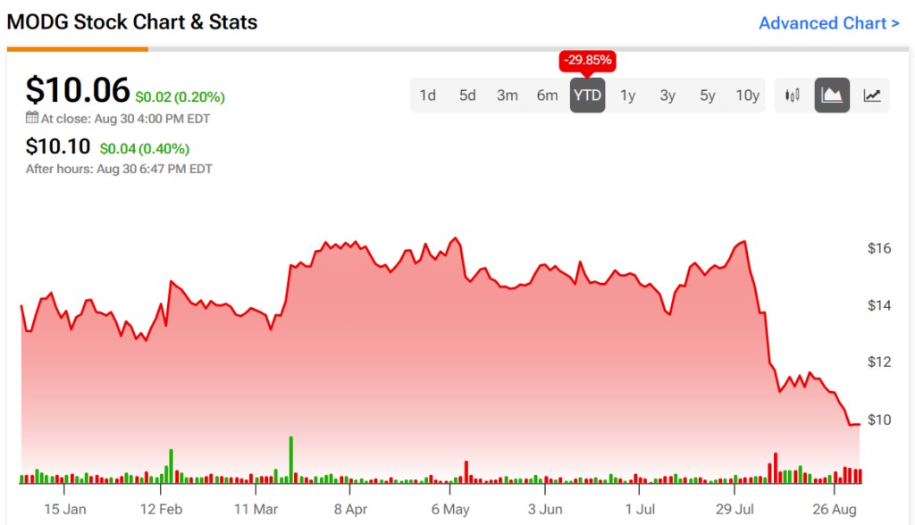 跟蹤該公司的分析師對 MODG 股票持謹慎樂觀態度。例如,傑富瑞分析師蘭達爾·科尼克最近將股票評級從買入調降至持有,目標價從 40 美元降至 12 美元,指出公司的盈利質量已經下降。同時,債務累積引發了擔憂。