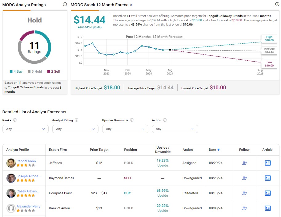 根據 11 位分析師最近的建議和目標價,Topgolf Callaway Brands 被評為持有。MODG 股票的平均目標價為 14.44 美元,相較當前水平有 43.54% 的潛在上漲空間。