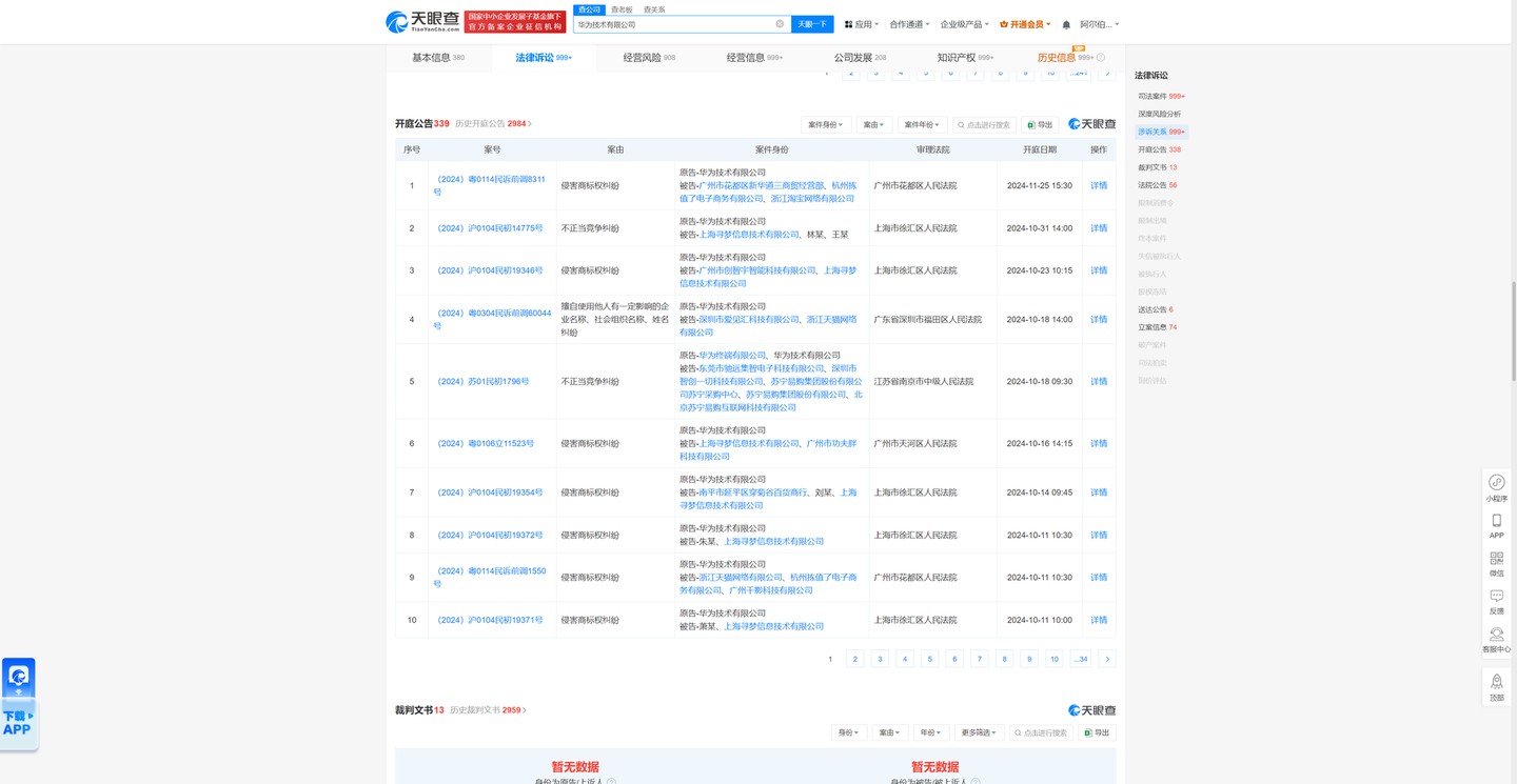 Huawei is being sued for contract disputes, with cases involving Liaoning, Inner Mongolia, Shanghai, and other places this year