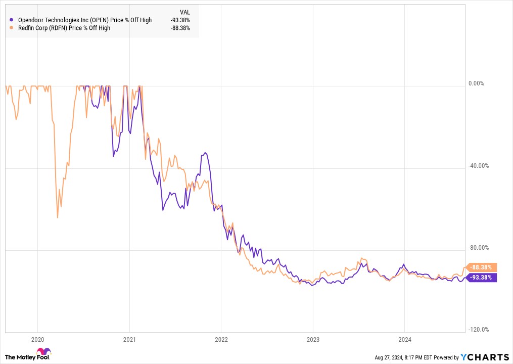 As the chart below shows, Opendoor and Redfin are both down sharply from their previous peaks.