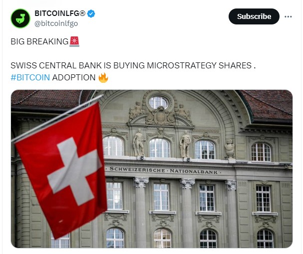 On September 2nd, the news agency BITCOINLFG posted on platform X that the Swiss National Bank is buying shares of Microstrategy. Microstrategy, a US technology listed company, whose founder Michael J. Saylor is a staunch Bitcoin enthusiast, has been continuously purchasing Bitcoin since August 2020.