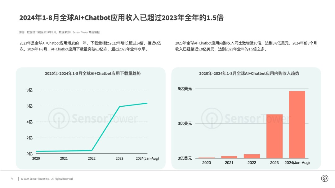 2024 年前 8 個月,全球 AI+Chatbot 應用內購收入接近 5.8 億美元,已經超過 2023 年全年的 1.5 倍之多。