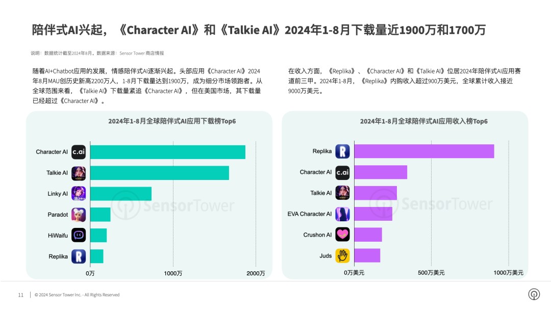 隨着 AI+Chatbot 應用的發展,情感陪伴式 AI 逐漸興起。頭部應用《Character AI》2024 年 8 月 MAU 達歷史新高 2200 萬人,1-8 月下載量近 1900 萬,成為細分市場領跑者。從全球範圍來看,《Talkie AI》以 1700 萬下載量緊追《Character AI》,但在美國市場,《Talkie AI》下載量已經超過《Character AI》。