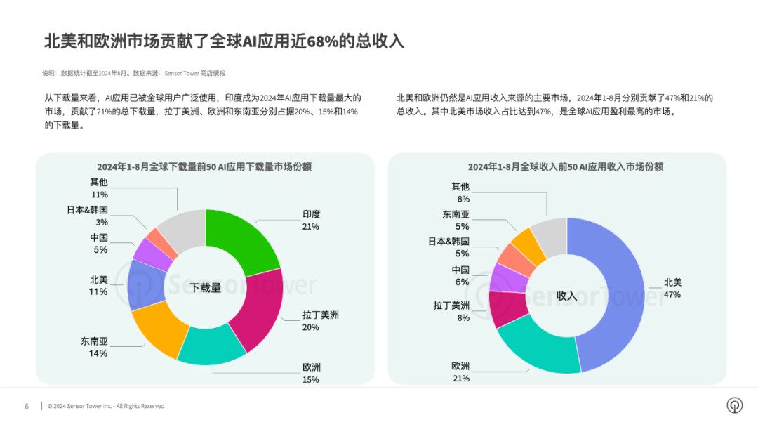 AI 應用廣泛被全球各地用户下載使用,但收入主要來源於北美市場。從下載量來看,印度成為 2024 年 AI 應用下載量最大的市場,貢獻了 21% 的總下載量。北美市場貢獻了 47% 的全球 AI 應用總收入,是 AI 應用盈利最高的市場。