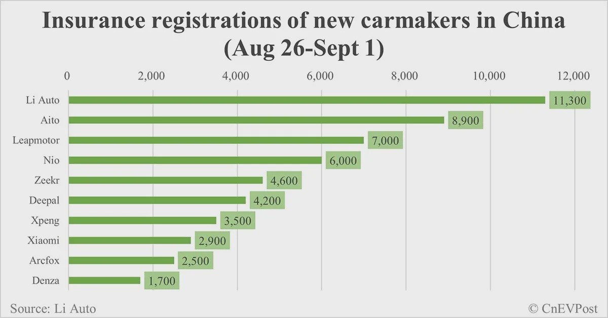 Li Auto had 11,300 insurance registrations last week, Xpeng 3,500, Zeekr 4,600, Leapmotor 7,000 and Aito 8,900.