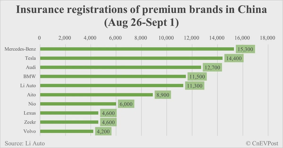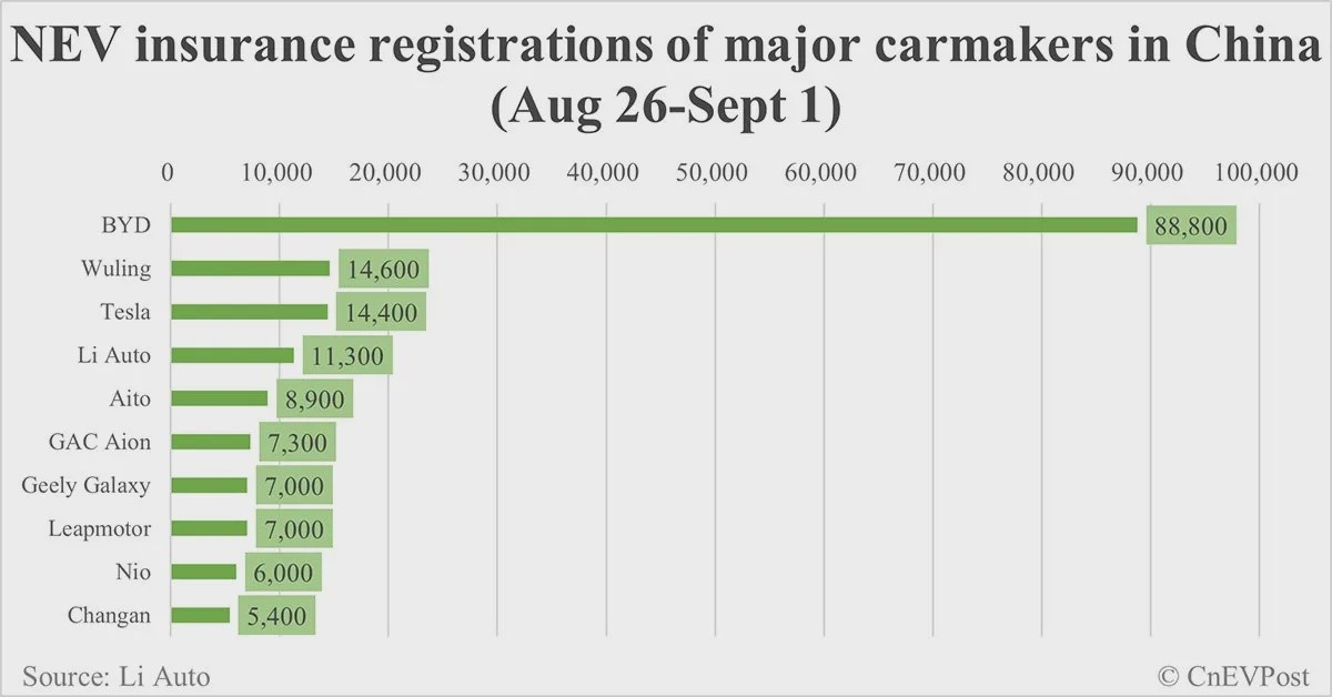 China EV insurance registrations for week ending Sept 1: Nio 6,000, Tesla 14,400, Xiaomi 2,900, BYD 88,800