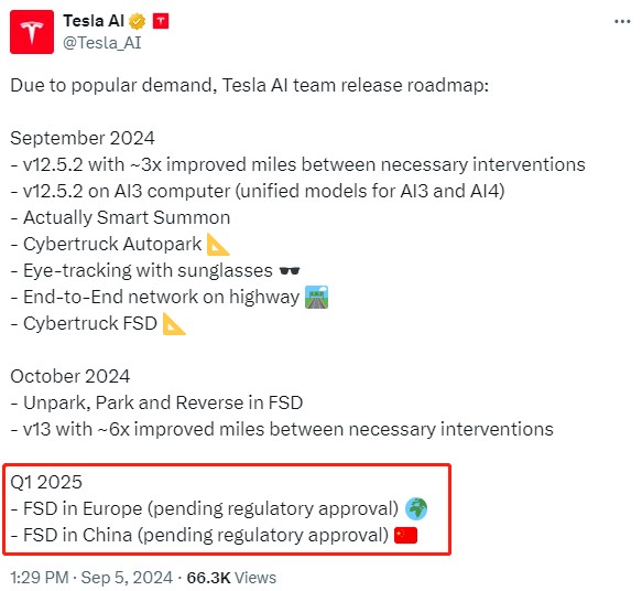 Today, the Tesla AI team released the product roadmap, expecting to launch Fully Self-Driving (FSD) in China and Europe in the first quarter of 2025, but it is still pending regulatory approval.