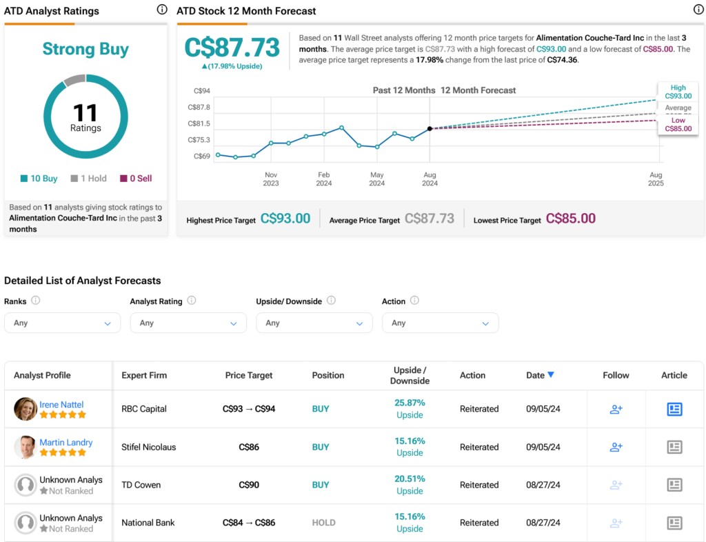 Turning to Wall Street, analysts have a Strong Buy consensus rating on TSE:ATD stock based on 10 Buys and one Hold assigned in the past three months, as indicated by the graphic below. After a 4.92% rally in its share price over the past year, the average TSE:ATD price target of C$87.73 per share implies 17.98% upside potential.