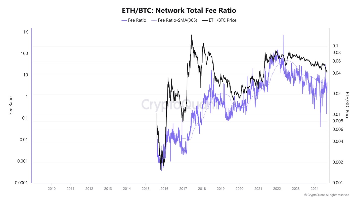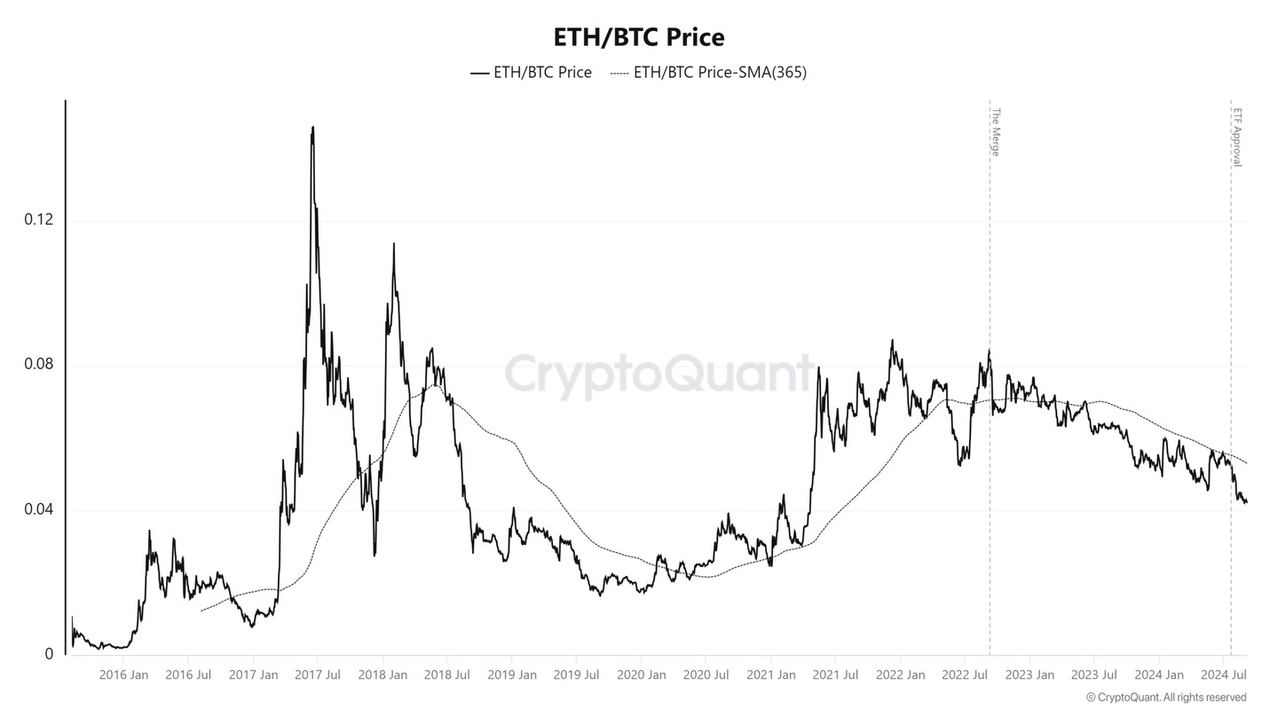 The ETH/BTC price, at press time, stood at 0.0425, marking its lowest level since April 2021.