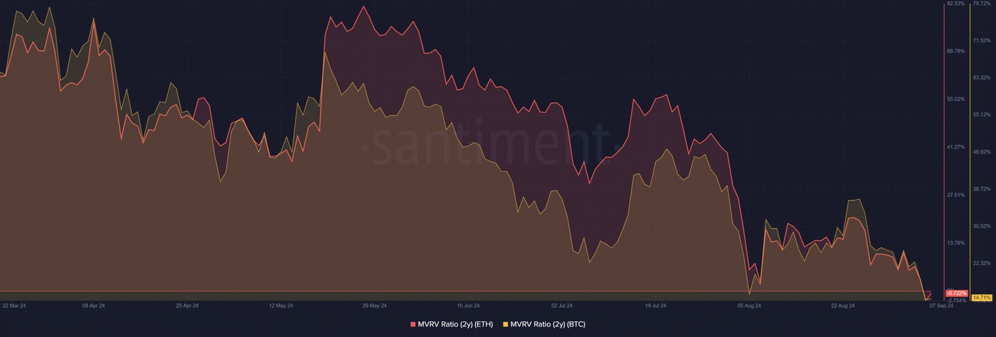 Finally, an analysis of the two-year Market Value to Realized Value (MVRV) ratio for Ethereum and Bitcoin highlighted the growing disparity between the two assets.
