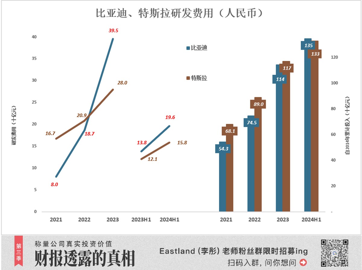 From 2014 (inclusive) to 2023, BYD and Tesla's cumulative R&D investments were 114.4 billion and 117 billion respectively; by the end of June 2024, BYD's cumulative R&D investment reached 134.6 billion (since 2014).