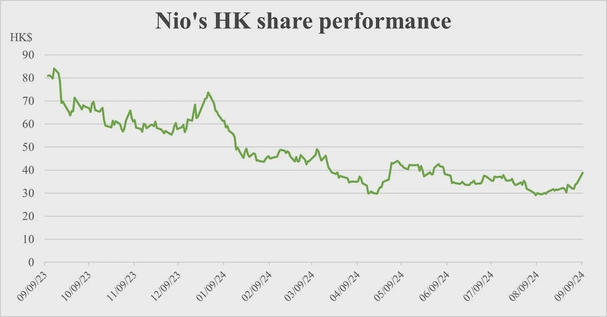 At press time, Nio was up 13.93 percent to HK$38.85, its biggest intraday gain since May 2.