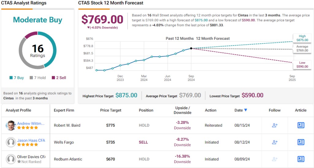 As for Wall Street’s overall stance on Cintas, the stock holds a Moderate Buy consensus, based on 16 analyst reviews: 7 Buys, 7 Holds, and 2 Sells. However, with a current trading price of $802 and an average price target of $769, analysts project a potential decline of 4% from current levels. (See CTAS stock forecast)