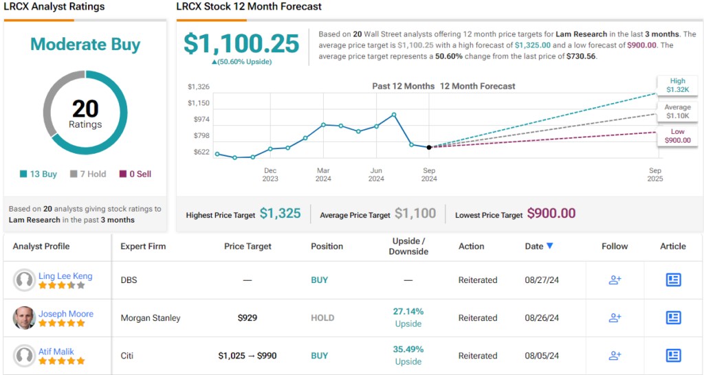 The general view of LRCX from the Street is a Moderate Buy, based on 20 reviews that include 13 to Buy and 7 to Hold. The shares are trading for $729.10 and the average target price of $1,100.25 points toward a gain of ~51% on the one-year horizon. (See LRCX stock forecast)