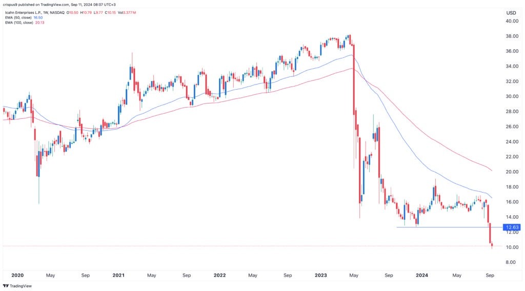 Icahn Enterprises (NASDAQ: IEP) stock price is falling apart as concerns about its dividend safety continues. It has crashed to $10, down by over 40% this year and by over 53% in the last 12 months.