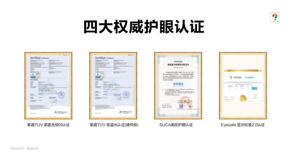 Specifically, Xueersi Xuelianji's LCD-type paper eye protection color screen provides a more comfortable user experience through low blue light and a 9-layer eye protection process, achieving 100% SRGB color gamut and reducing visual fatigue. Particularly in the field of blue light protection, Xueersi Xuelianji has obtained four authoritative eye protection certifications, including Rheinland TUV Rheinland Flicker-Free Certification, Rheinland TUV Low Blue Light Certification (hardware level), Eyesafe Display Standard 2.0 Certification, and SUCA Paper-like Eye Protection Certification