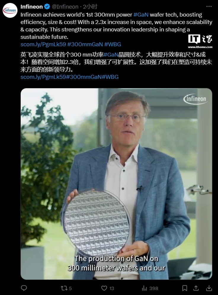 Infineon announced the successful development of the world's first 300mm gallium nitride (GaN) wafer technology, which improves chip production efficiency and provides a 2.3 times increase in chip output. This technology will be widely used in industrial, automotive, consumer electronics, and other fields to ensure stable customer supply. CEO Jochen Hanebeck stated that this breakthrough will change the industry landscape, with Infineon committed to becoming a leader in the GaN market and planning to expand GaN production capacity according to market demand