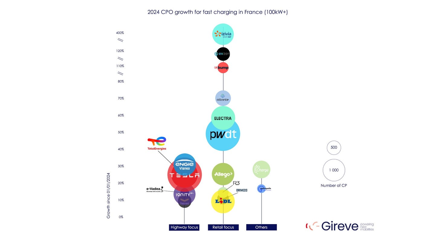 2024 年,专注于零售位置的 CPOs 正在推动最快的增长。特别是 Powerdot,已超越其他任何法国运营商,安装了更多的快速充电器。他们的增长策略侧重于为驾驶员提供便利,将充电器放置在人们倾向于长时间停车的地方。