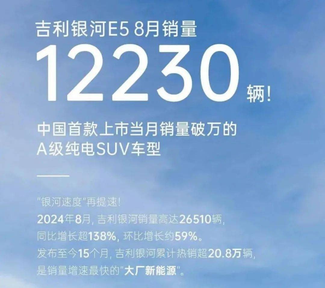 根據廠商公佈的數據,8 月 3 日上市的銀河 E5,首月銷量達到 1.2 萬輛,官方直接打出:“首款上市當月銷量破萬的 A 級純電 SUV 車型”的標語,前綴確實有點多,但它的意義也確實不小。