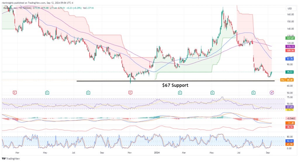 Now, let’s examine what the charts have to say about Moderna’s stock price trajectory. The technical indicators may provide further insights into whether the recent decline represents a buying opportunity or signals continued downside risk.