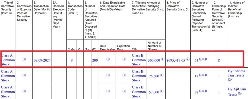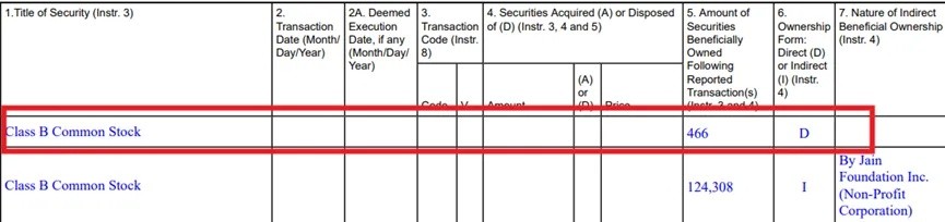 截至最新,Jain 持有 466 股 B 類股票(表紅框的部分),而高達 12.43 萬股 B 類股票的間接受益方是 “Jain Foundation Inc.”,即上文提及的治療罕見疾病的基金會。