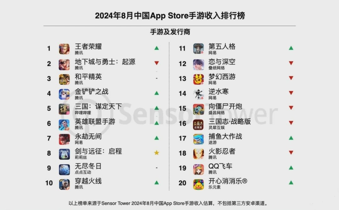 2024 年 8 月中國 App Store 手遊收入排行榜前四均為騰訊旗下游戲,分別為《王者榮耀》、《地下城與勇士:起源》、《和平精英》、《金剷剷之戰》。