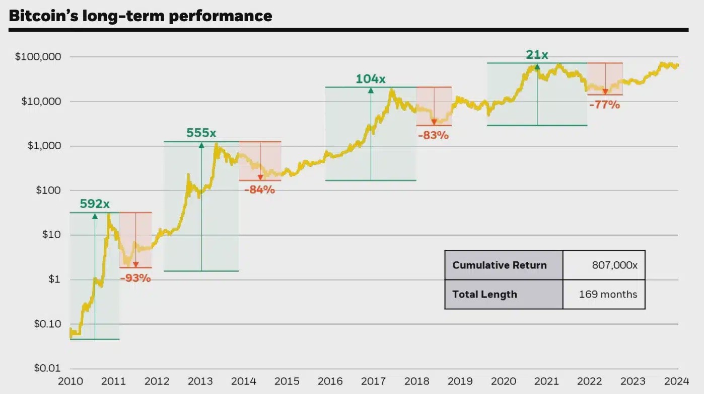This remarkable growth occurred despite Bitcoin being the poorest performer in three of those years, marked by four significant drawdowns exceeding 50%.