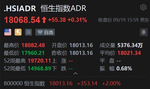 智通財經 APP 獲悉,週四美股三大指數集體大漲,恒生指數 ADR 上漲,按比例計算,收報 18068.54 點,較香港收市上漲 55.38 點或 0.31%。