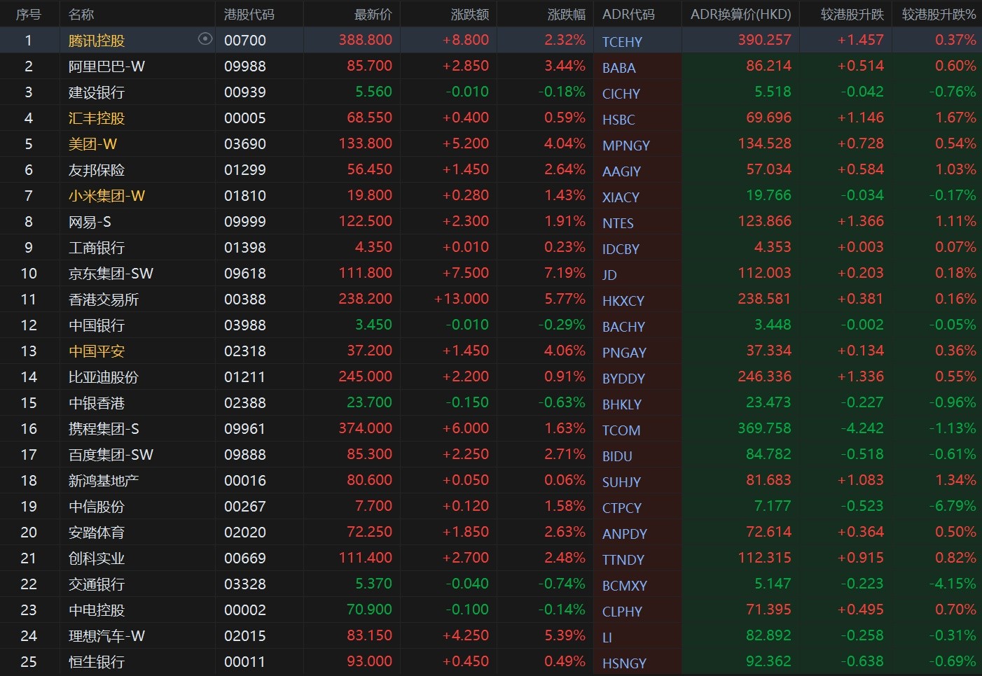週四美股三大指數集體大漲,恒生指數 ADR 上漲,按比例計算,收報 18068.54 點,較香港收市上漲 55.38 點或 0.31%。大型藍籌股漲跌不一,滙豐控股收報 69.696 港元,較香港收市漲 1.67%;騰訊控股收報 390.257 港元,較香港收市漲 0.37%。