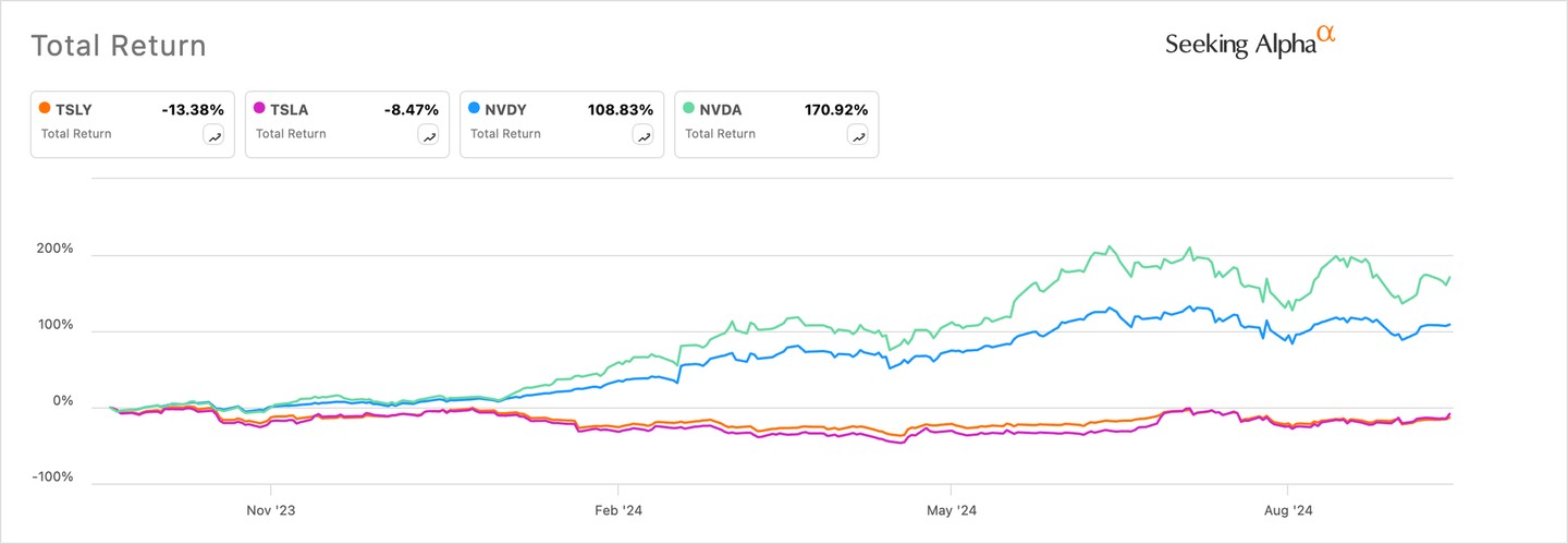 The same has happened in the last twelve months as the NVDY has risen by 170% while NVDA rose by 108%. TSLY has dropped by 13.3% while TSLA has fallen by 8.4% in the same period.