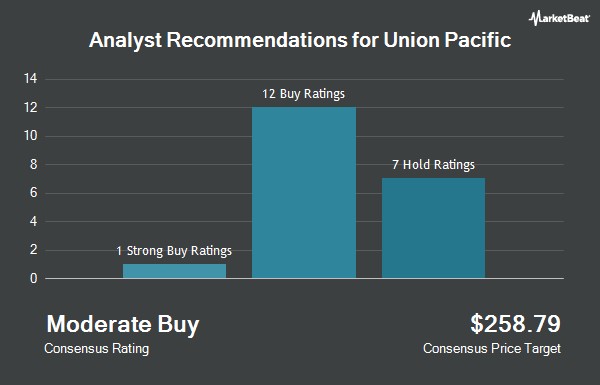 Shares of Union Pacific Co. (NYSE:UNP - Get Free Report) have been assigned an average rating of "Moderate Buy" from the twenty analysts that are covering the company, MarketBeat.com reports. Seven analysts have rated the stock with a hold recommendation, twelve have given a buy recommendation and one has assigned a strong buy recommendation to the company. The average 12 month price target among analysts that have issued a report on the stock in the last year is $258.79.