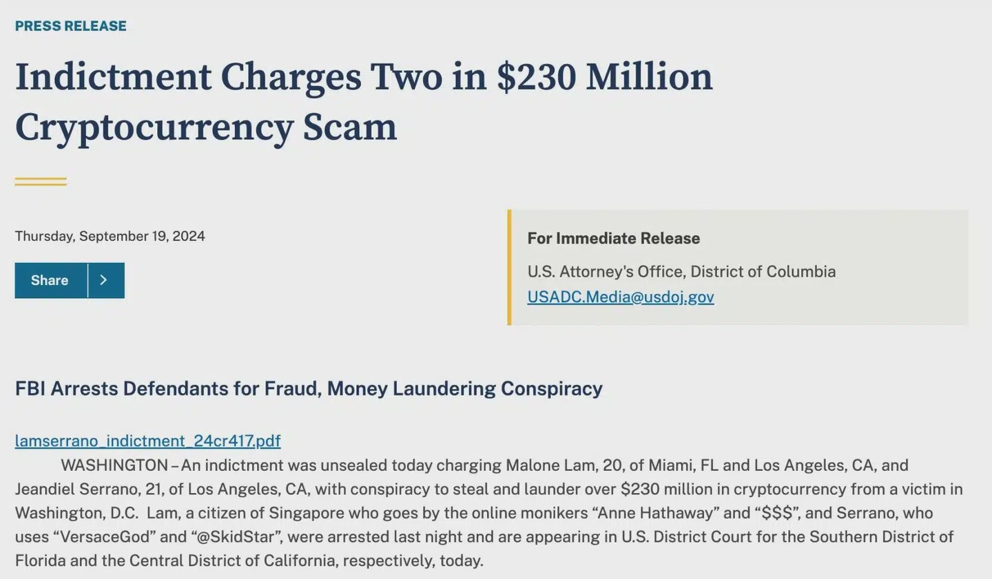 - 涉及复杂社会工程策略的 2 亿 4300 万美元加密货币盗窃案中,两名嫌疑人已被捕。