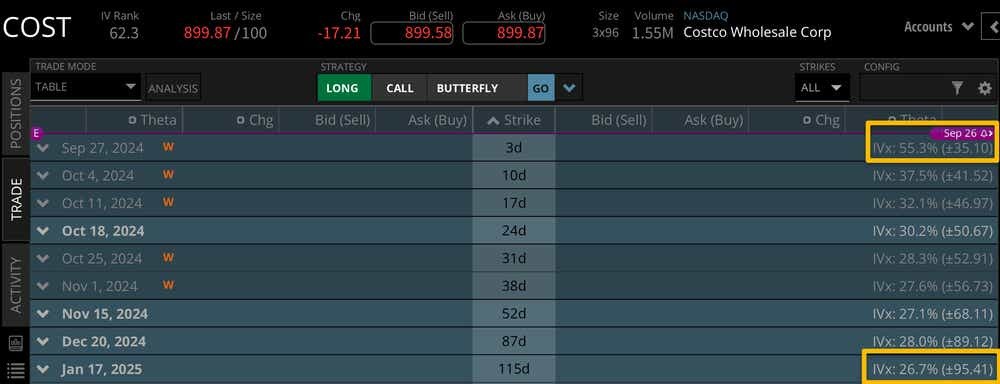Costco 今年上漲超過 37%,接近歷史高位。隱含波動性相對於其他已經發布財報的熱門股票符號較低。觀察本週預期的股價波動,我們可以看到未來幾天的預期股價波動為 +/- 35.10 美元。