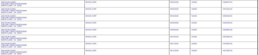 根据最新的监管文件,在 6 月 13 日至 9 月 12 日期间,黄仁勋在 50 个交易日内进行了减持操作,每次减持 12 万股。