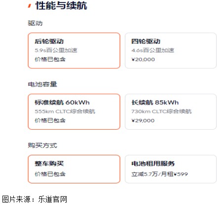 智通財經 APP 瞭解到,樂道 L60 整車標準續航版售價 20.69 萬元,選配四輪驅動加 2 萬元,若選配長續航 85 度電池版本,再加 2.9 萬元,選配完高配版本為 25.59 萬元,另外,消費者可選擇整車購買和電池租用服務,選電池租用的 60 度電池減少 5.7 萬元,月租 599 元,85 度電池減少 8.6 萬元,月租 899 元。