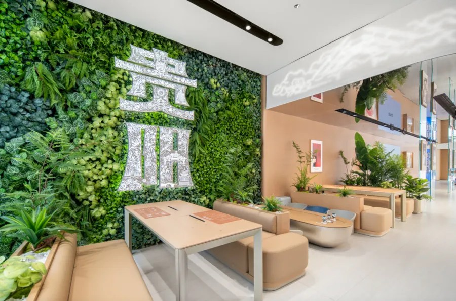 The new store closely follows the design elements of "Guiyang" regional cultural colors, displaying the shapes of Jiaxiu Tower and Fanjing Mountain in Guiyang. On the second floor of the flagship store, there is a wall with green plants as the base, outlining the combination of the two characters "Guiyang". This design is particularly in line with the needs of online celebrities for check-ins.