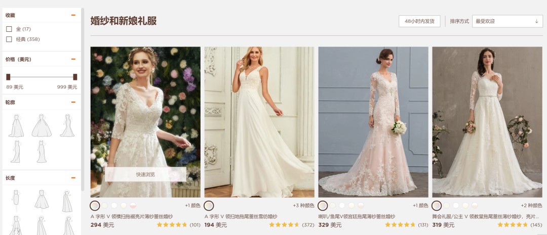 在獨立站上,JJ'SHouse 從用户角度出發,對產品進行了詳細的分類。JJ'SHouse 的導航系統主要以角色(如新娘、伴娘、花童等)、場合(如婚禮、晚宴、派對等)、風格(簡約、性感、正式等)作為分類,方便用户根據需求,按圖索驥,快速找到符合自己需求的款式,提升用户的購物體驗。