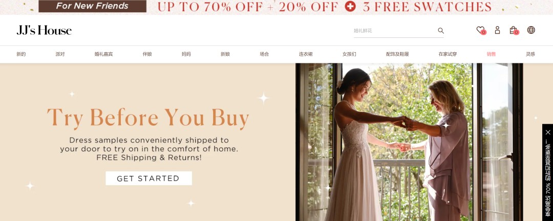 值得一提的是,JJ'SHouse 還創新性地提出了 “在家試穿” 服務,降低購買門檻。用户只需在獨立站上選擇 1-3 件心儀的服裝,支付一定的試穿費用(伴娘、新娘母親和特殊場合禮服每件 10 美元;新娘禮服每件 15 美元),JJ'SHouse 便會將服裝樣品直接寄送到消費者的家門口。