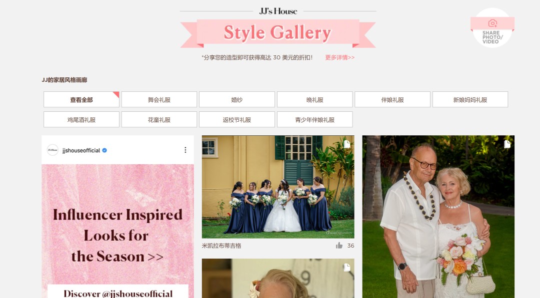 在獨立站上,JJ'SHouse 專門創建了一個欄目 “Style Gallery(風格畫廊)”,利用相關的獎勵機制,鼓勵用户分享自己穿着禮服、婚紗的真實照片和視頻,並將 “風格畫廊” 裏的照片以輪播的形式出現在每一個產品詳情頁的下方。