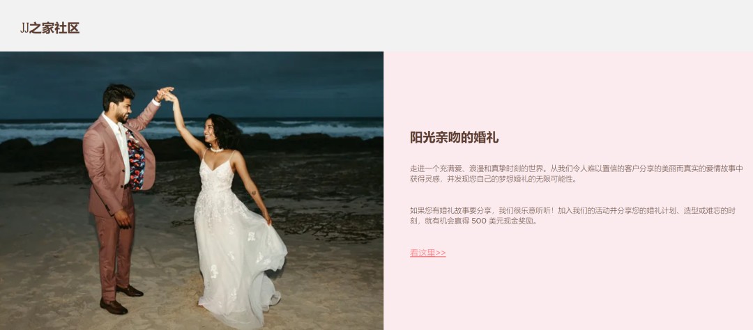 同時,JJ'SHouse 還設立了 “JJ's House Community”,在社區中設置 500 美金的現金獎勵,鼓勵用户投稿自己與 JJ'SHouse 的故事,分享婚禮計劃、造型或難忘的時刻,如穿着 JJ'sHouse 的婚紗參加婚禮、穿着 JJ'sHouse 的禮服參加父母的生日宴......