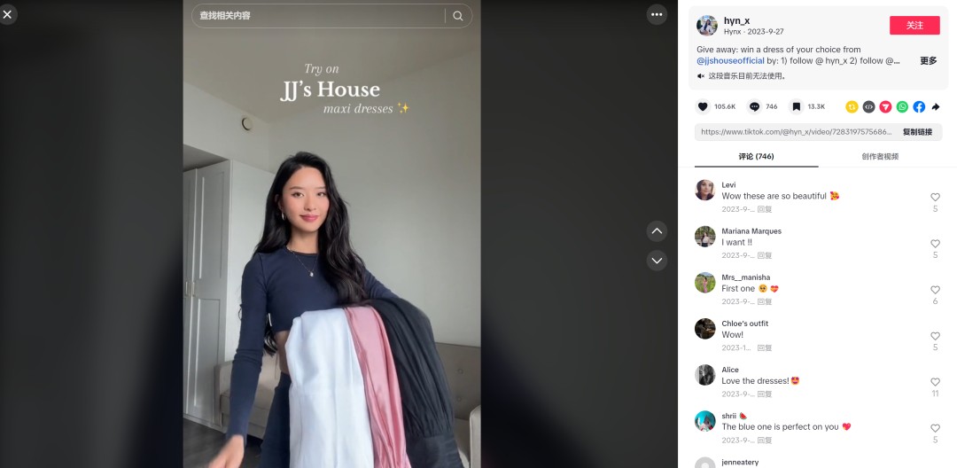 以 TikTok 上的穿搭博主 @hyn_x 為例,她在 TikTok 上屬於腰部博主,擁有 59.1 萬粉絲,在與 JJ'SHouse 的合作視頻中,@hyn_x 展示了多種不同特色和風格的禮服搭配,以生動、真實、貼近生活的方式將產品展現給粉絲。同時,@hyn_x 還在賬號下方附上活動信息,鼓勵用户參與活動,縮短成交鏈條,提高轉化。