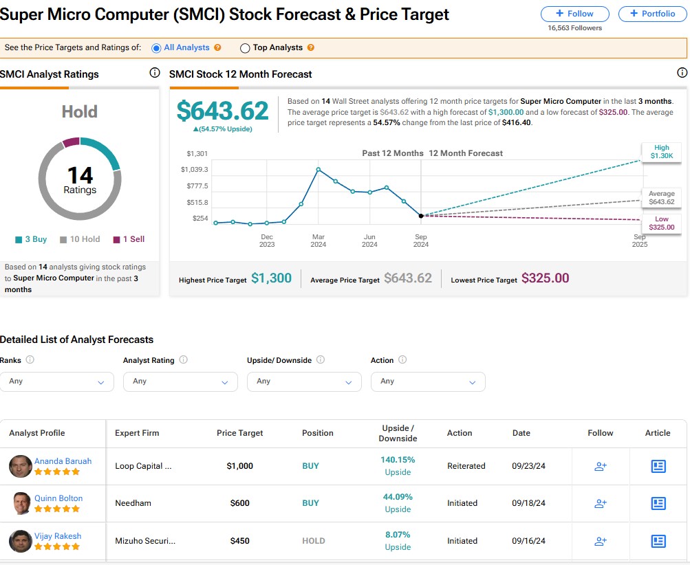 Super Micro Computer’s stock has a consensus Hold rating among 14 Wall Street analysts. This rating is based on three Buy, 10 Hold, and one Sell ratings issued in the past three months. The average price target on SMCI stock of $643.62 implies 54.57% upside from current levels.