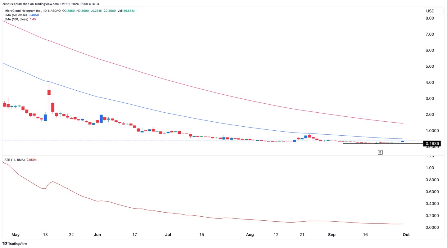 此外,MicroCloud Hologram 的股票技術指標疲弱。日線圖顯示,過去幾個月一直處於強勁的下降趨勢,並觸底於 0.1886 美元。