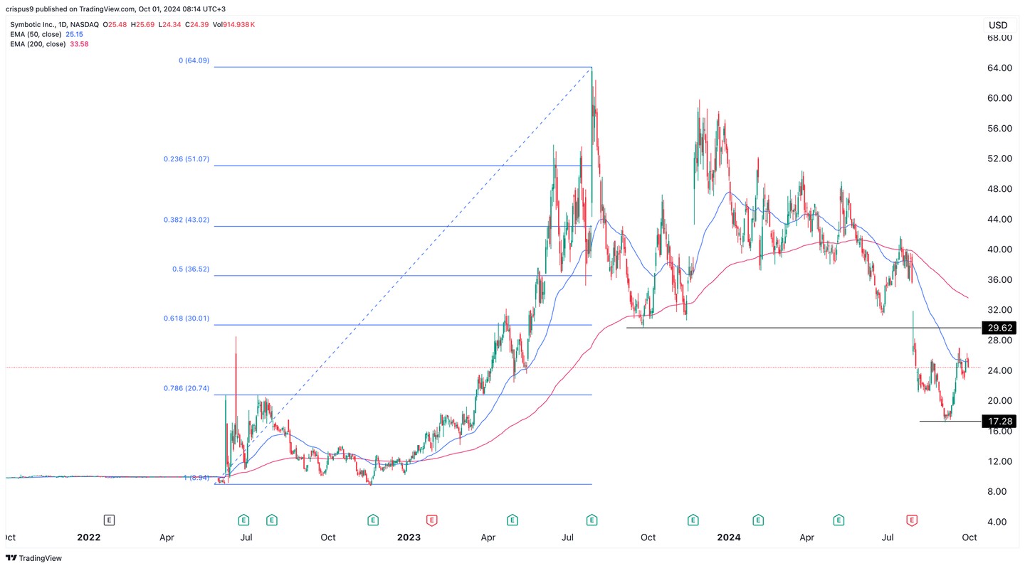The daily chart shows that the SYM share price peaked at $64 in July 2023 and then retreated to a low of $17.28 in August.