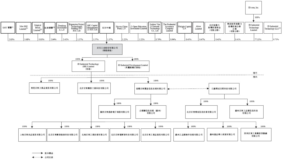 According to the prospectus, in the shareholder structure before listing, Mr. Liu Qiangdong's JD Group (09618.HK, JD.NASDAQ) holds 77.32% through JD Industrial Technology Limited;