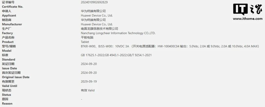 我們 IT 之家曾報道過,華為在 9 月 20 日有兩款平板電腦新品通過了 3C 認證,型號為 BTKR-W00、BJS5-W00,附贈 HW-100400C04 充電器,支持 40W 快充。