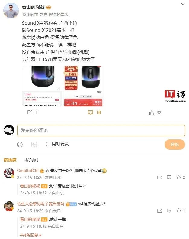 談起 Sound X4 的配置,@看山的叔叔 透露擁有 2 種配色,跟 Sound X 2021 基本一樣,新增悦動白色,保留韻律黑色。音箱沒有帝瓦雷,但有華為悦彰。