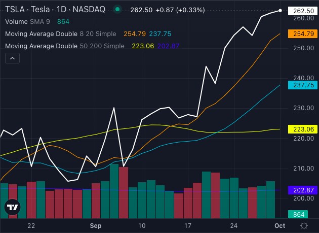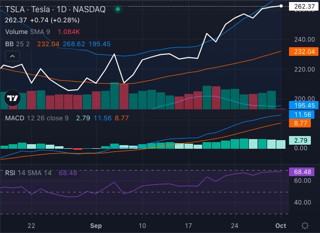 Tesla's stock surged 24.23% in September, outperforming its Magnificent Seven peers. Year-to-date, the stock has gained 5.32%. Key catalysts include strong sales in China and anticipation of the upcoming Robotaxi event on October 10, which CEO Elon Musk claims could be significant for the company. Analysts remain optimistic, with bullish technical indicators suggesting continued upward momentum, although the stock may be nearing overbought levels. Upcoming updates on delivery data and earnings will be crucial for sustaining this rally.